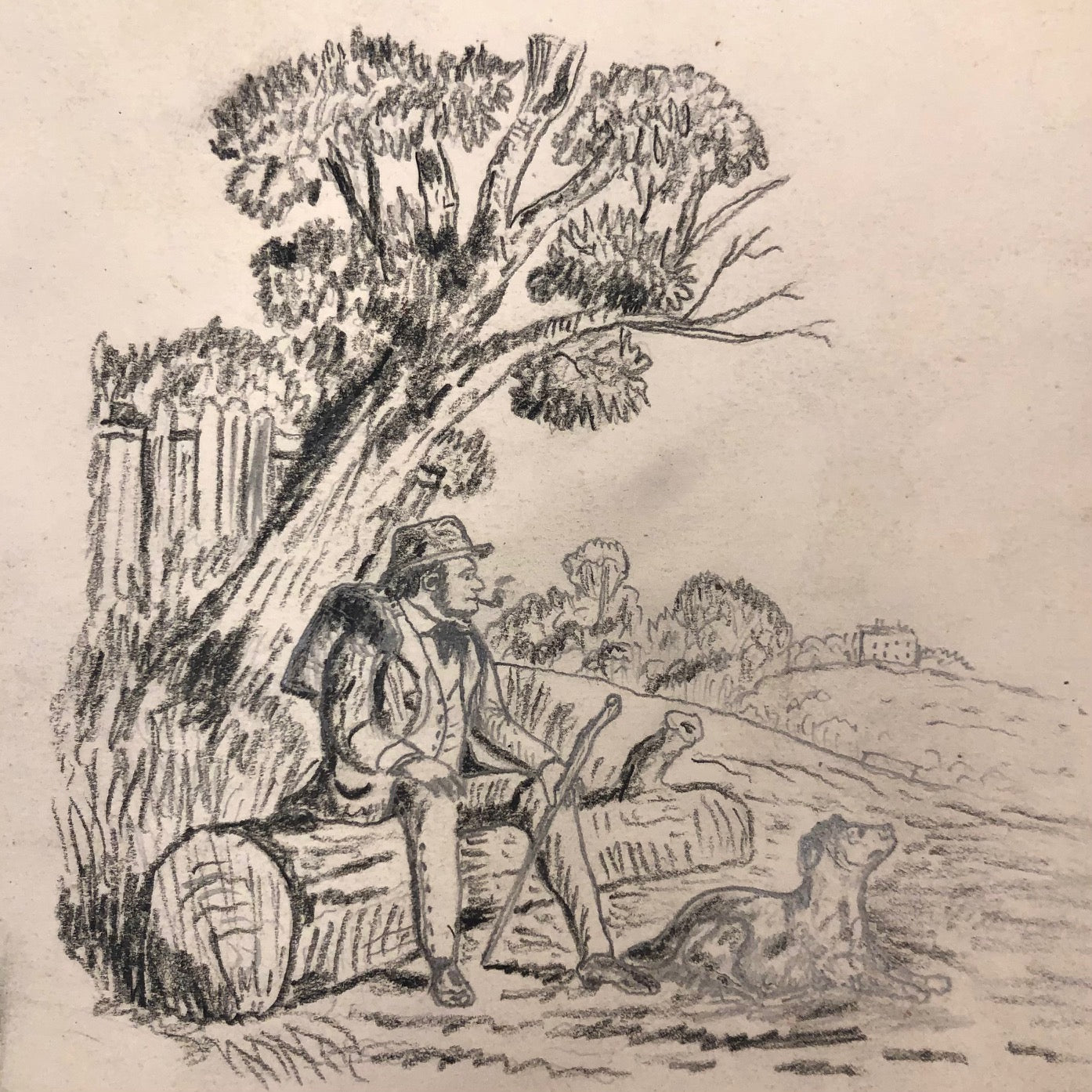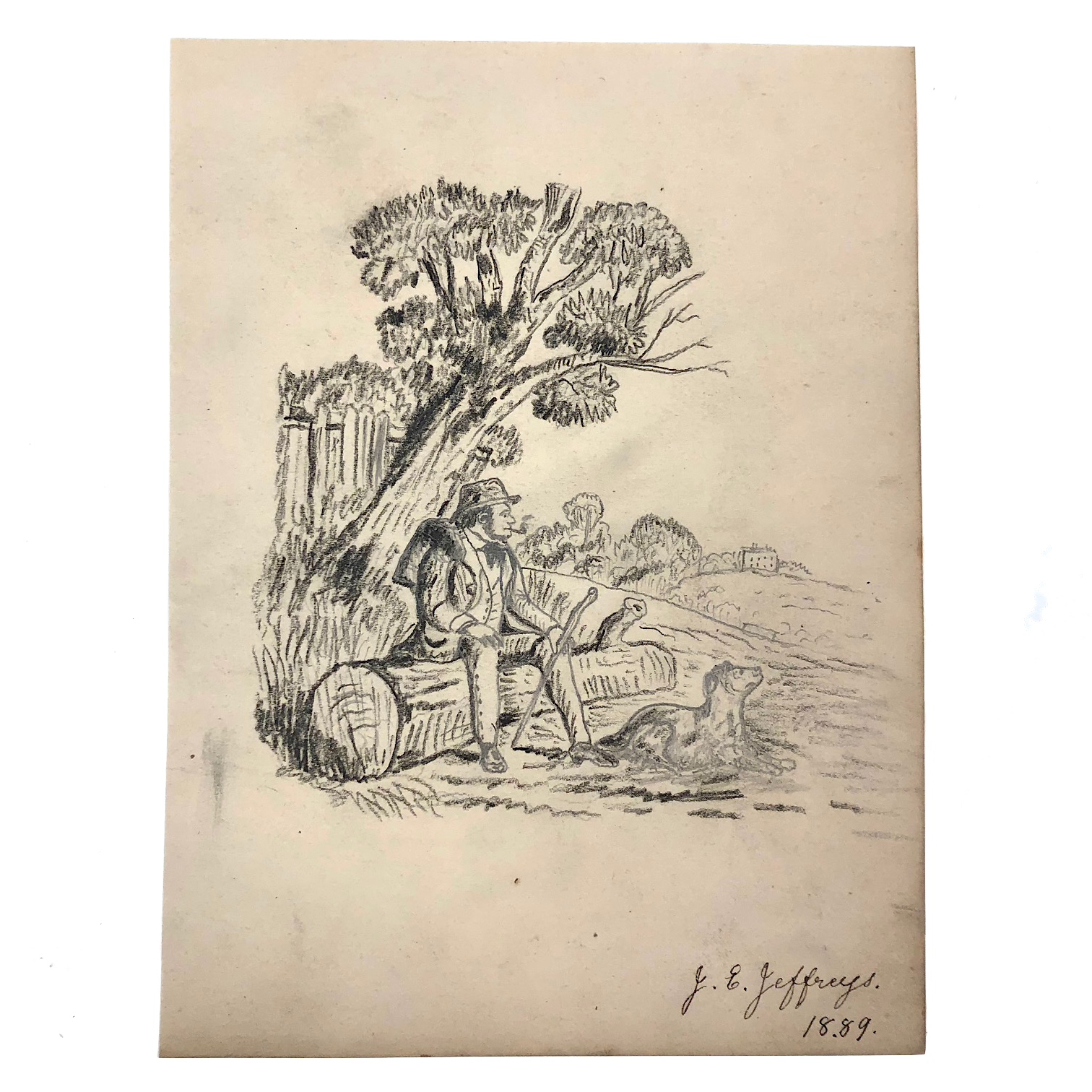 Feature-rich J.E. Jeffreys 1889 Pencil Drawing of Hiking Man and Dog