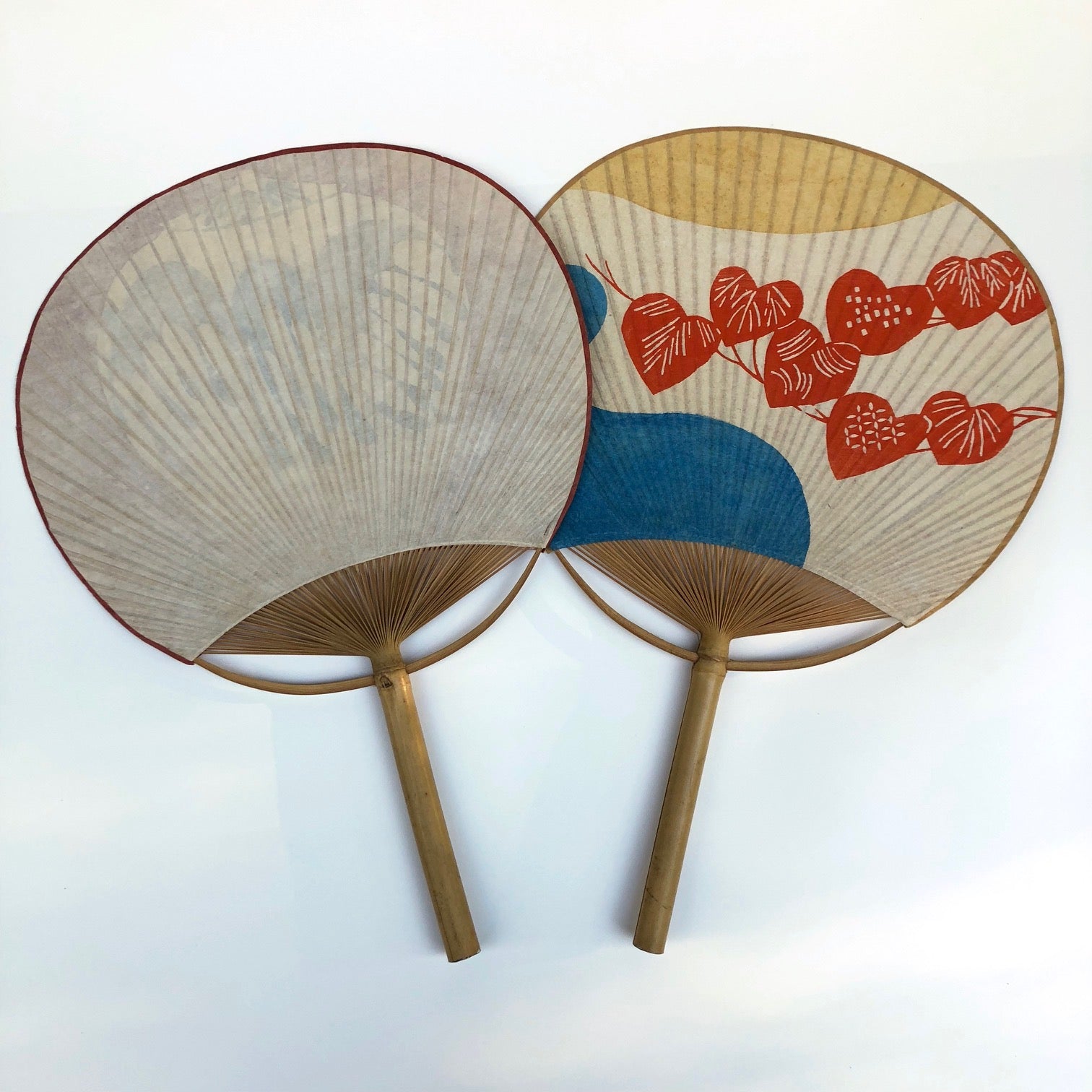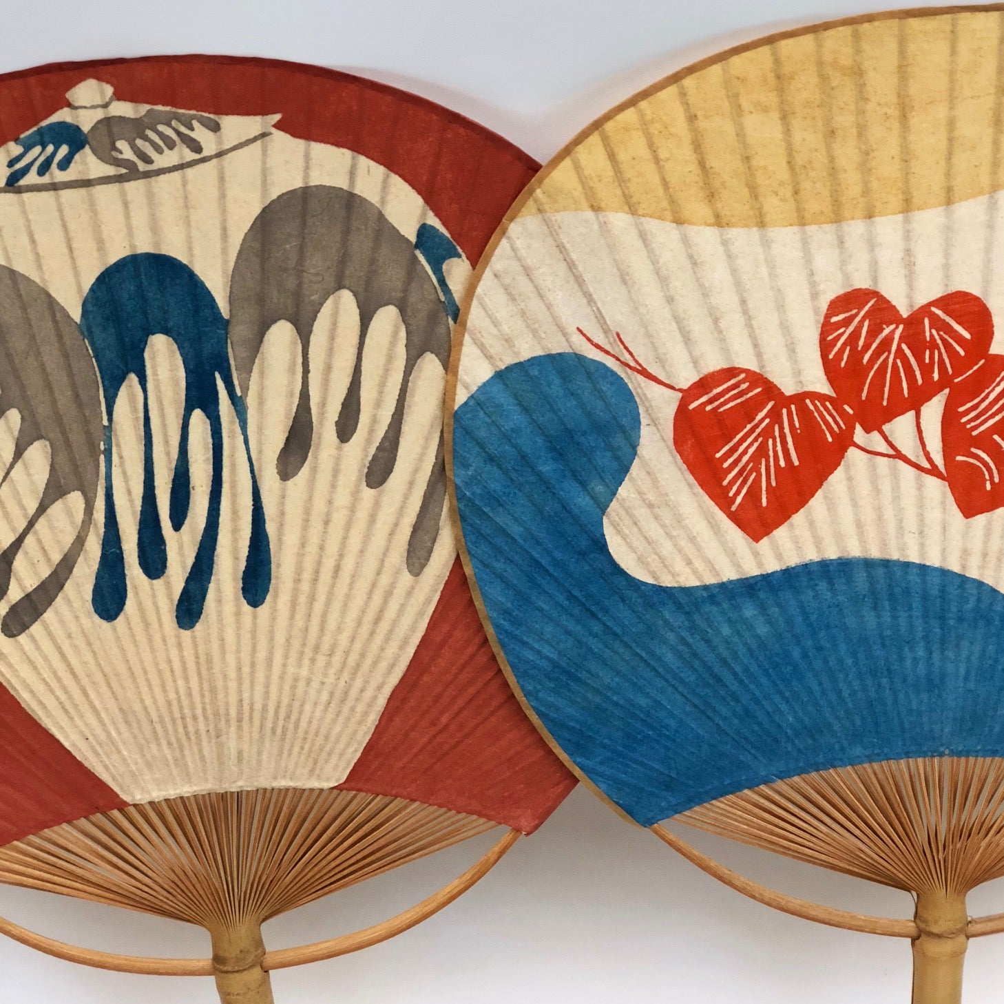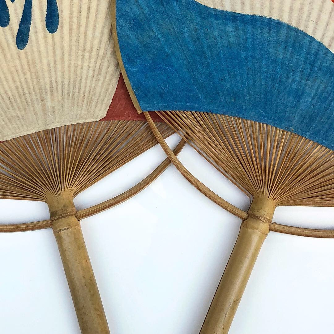 While the season for fanning my be over, I’d hang these vintage Japanese fans on the wall immediately to enjoy them as the gorgeous objects that they are all winter long—and to be reminded that summer will come again! These sorts of rigid paddle-shaped fans are called Uchiwa in Japanese; these are made of paper and bamboo, and I presume date from the 1950s or so. With their elegant graphics and terrific color palettes, they are really inspiring me add vintage Japanese fans to my ongoing collecting obsessions; I want to see a whole wall of them!