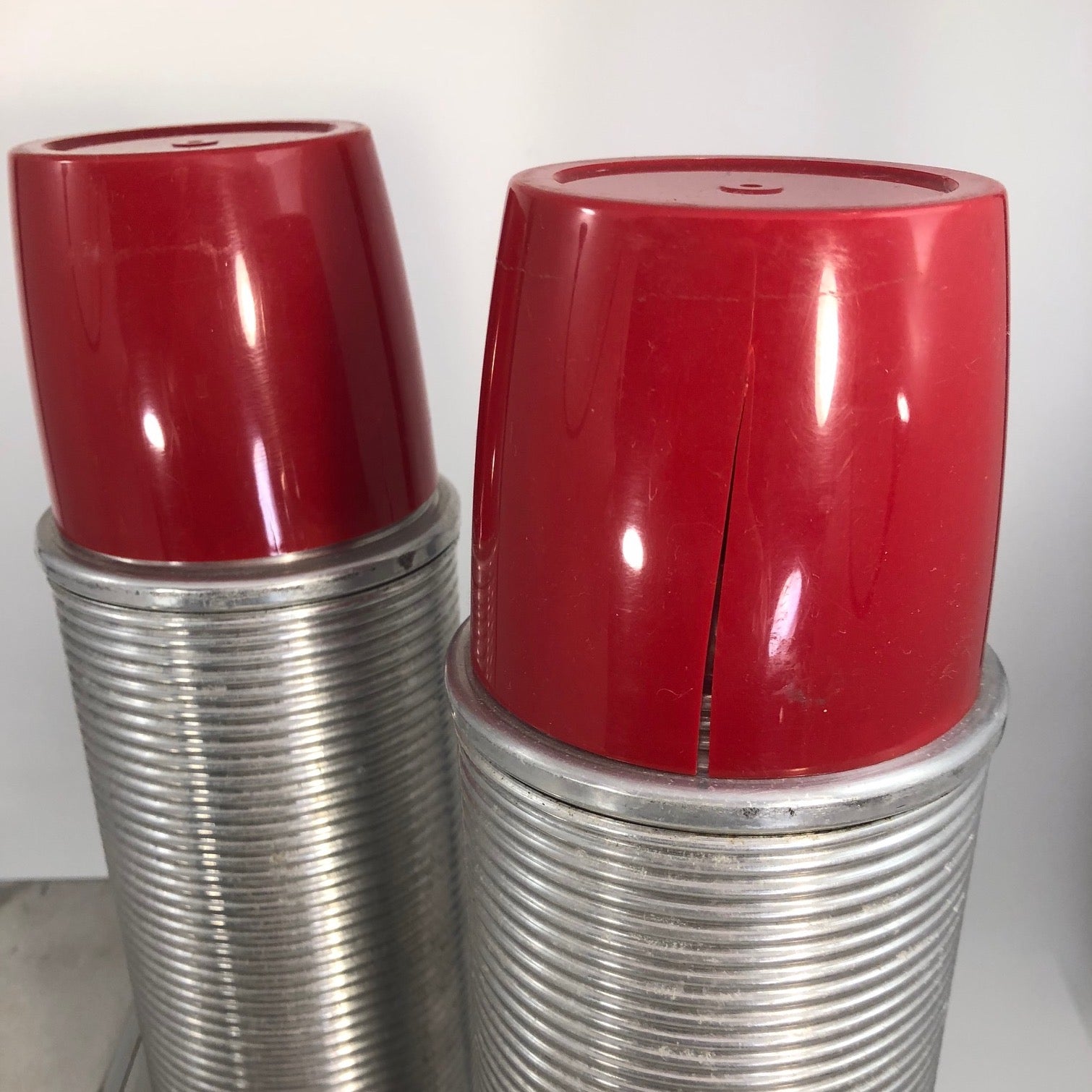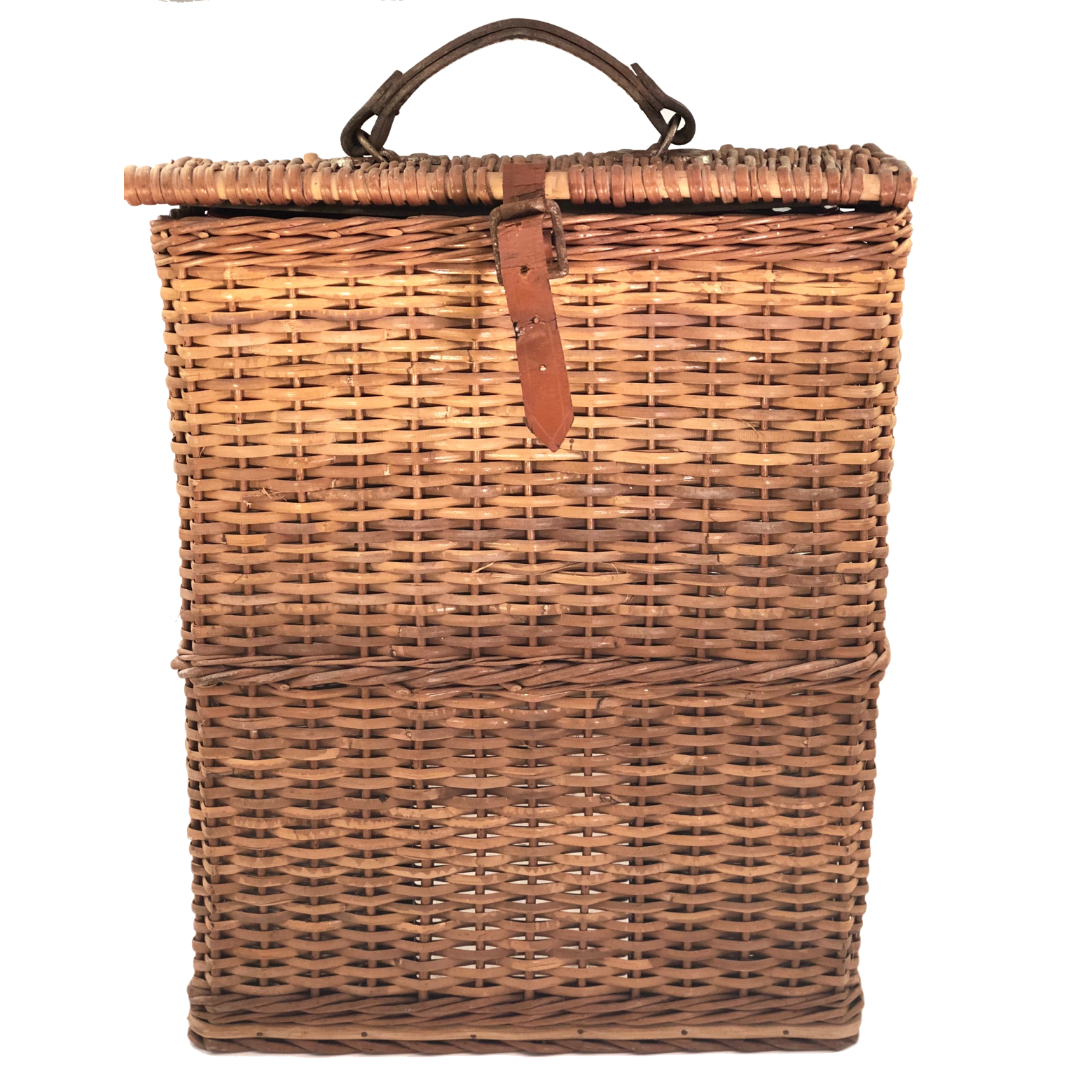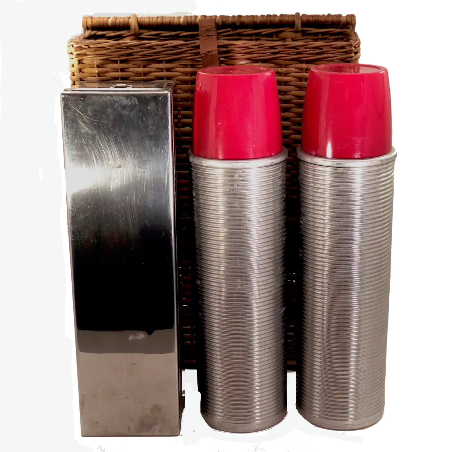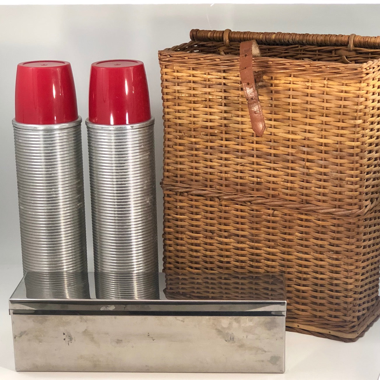 The basket measures 18 inches tall by 12.5" inches wide and 4.75" deep. The leather of the strap closure for the box is somewhat stiff/cracked, though still latches, and there is one crack in the exterior red cap of one of the thermoses. The set is otherwise in good overall condition.