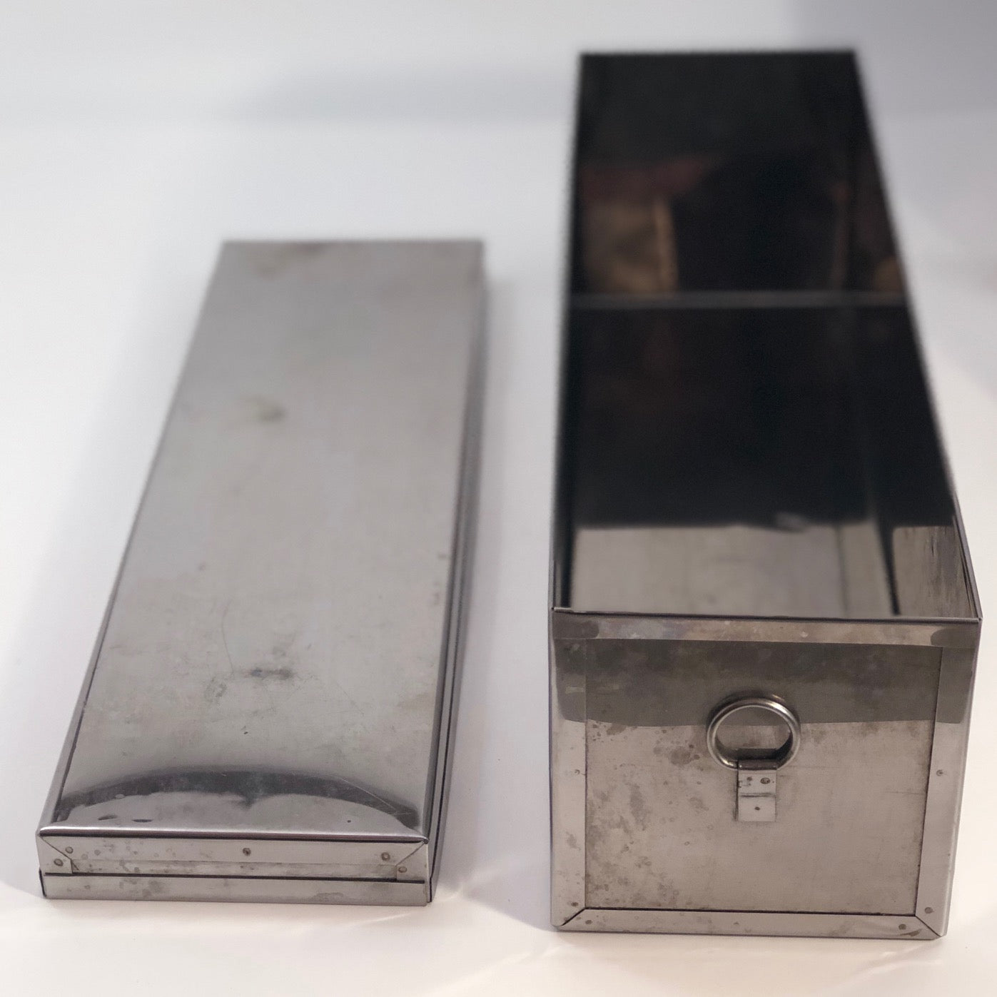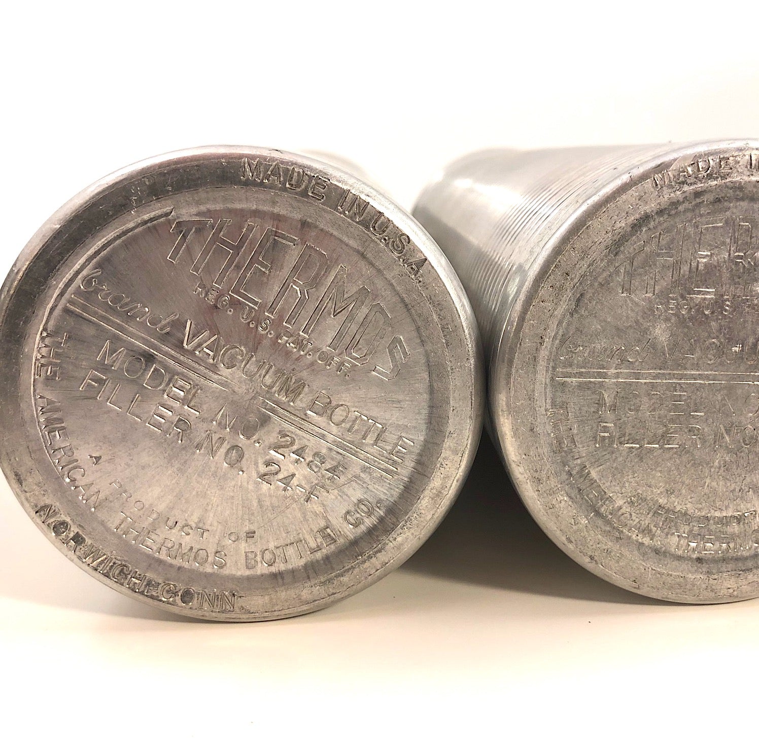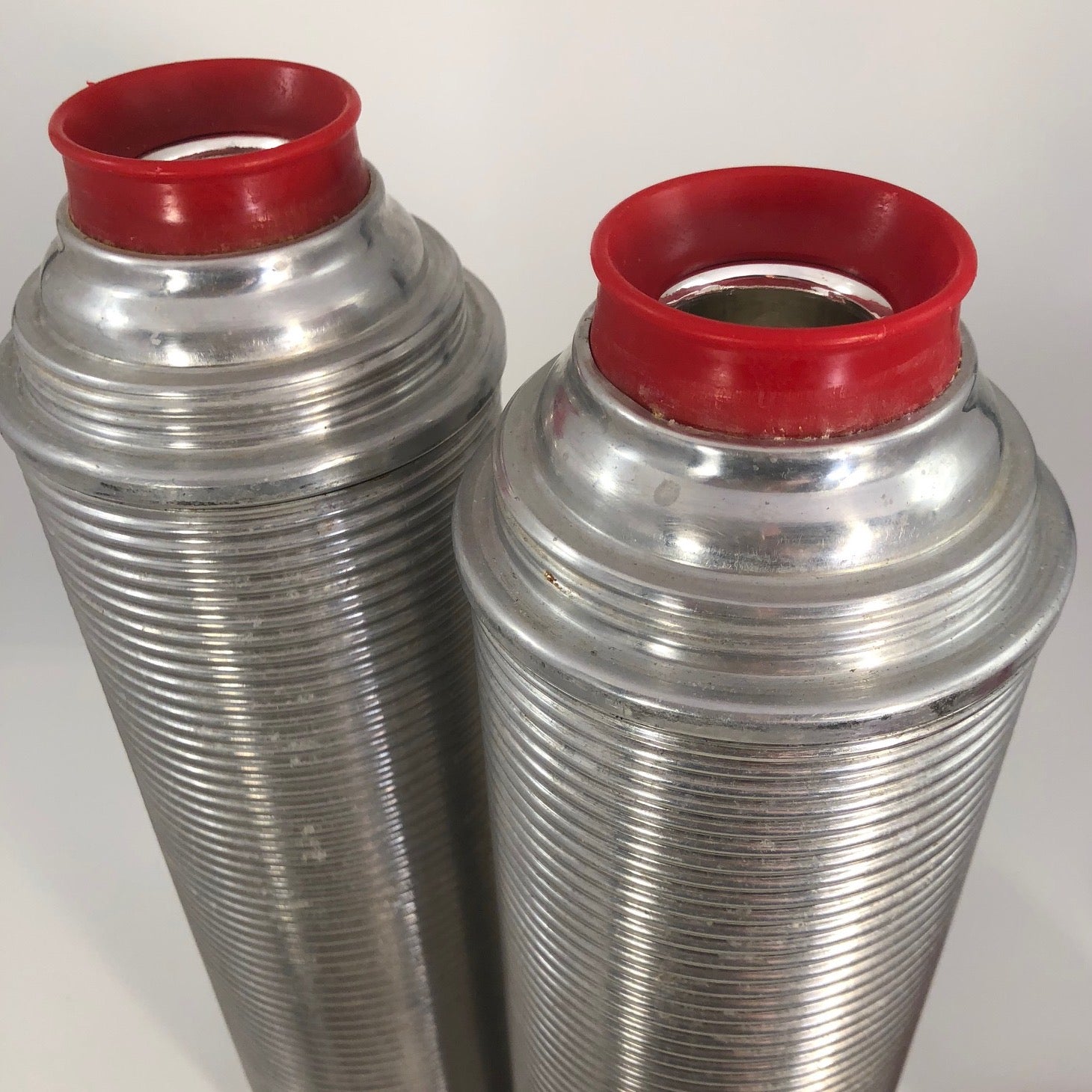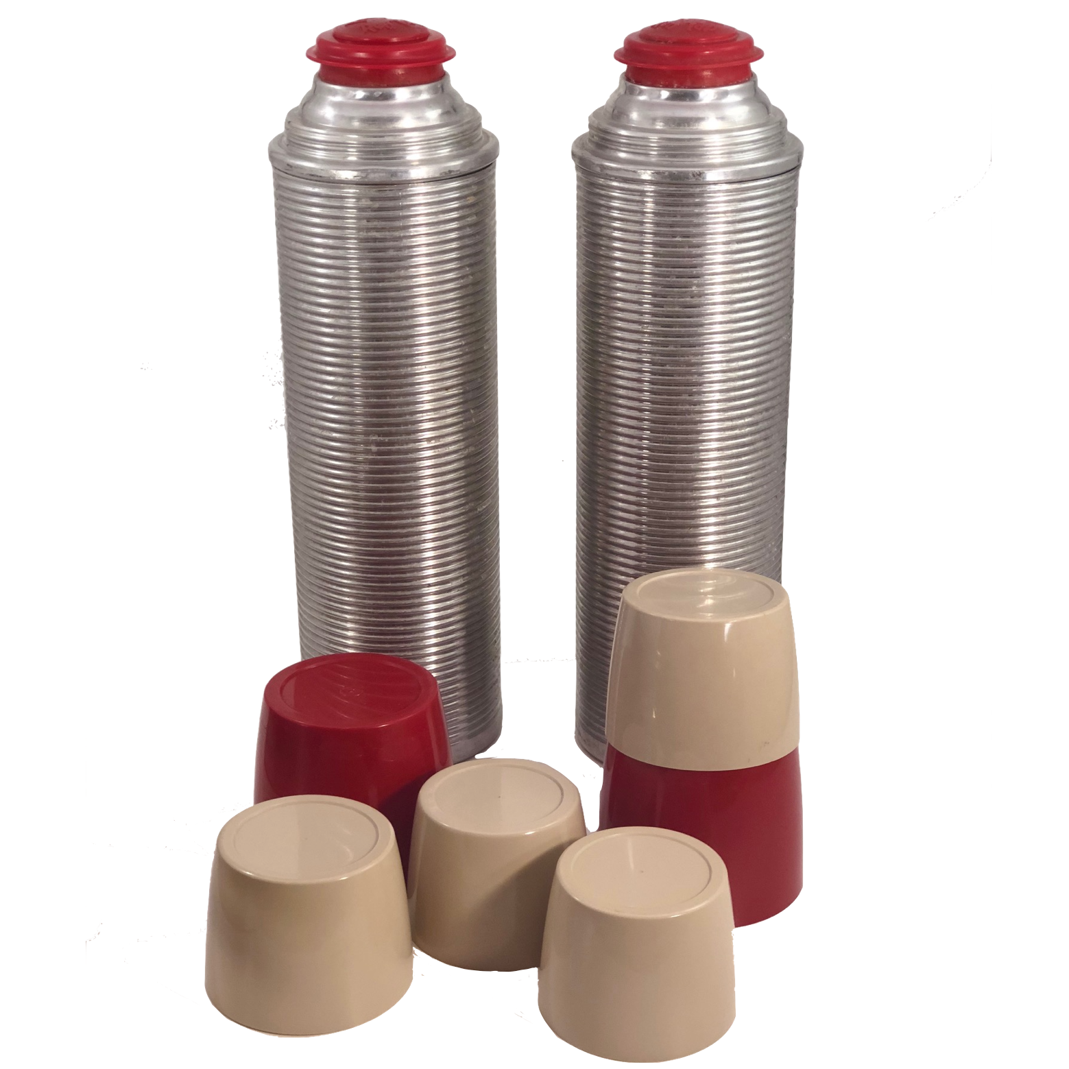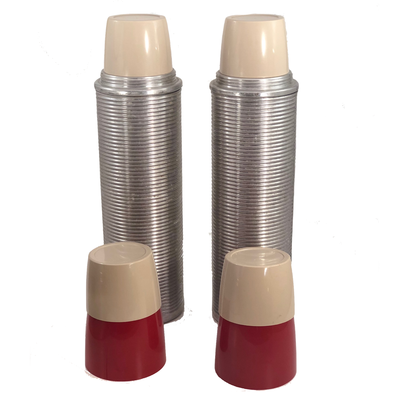 The basket measures 18 inches tall by 12.5" inches wide and 4.75" deep. The leather of the strap closure for the box is somewhat stiff/cracked, though still latches, and there is one crack in the exterior red cap of one of the thermoses. The set is otherwise in good overall condition.