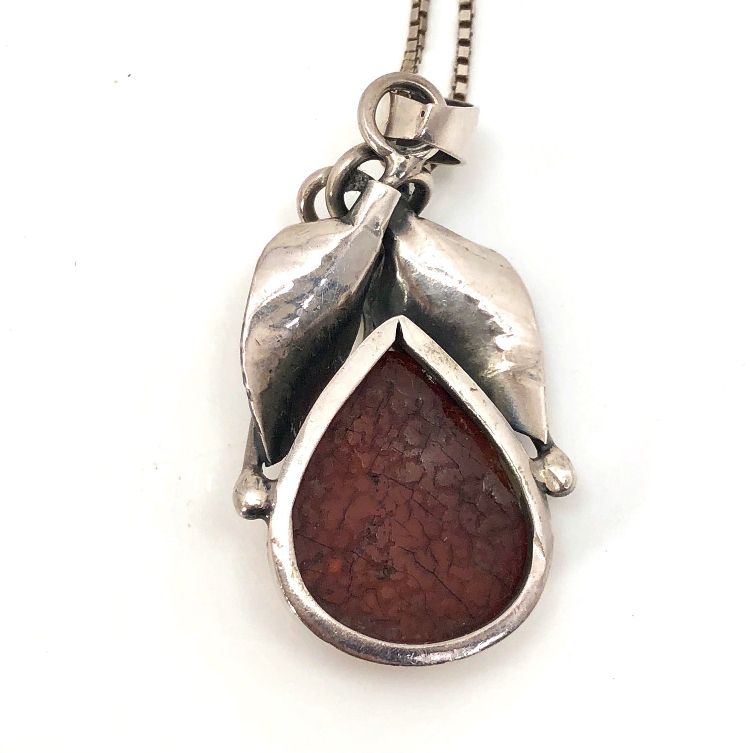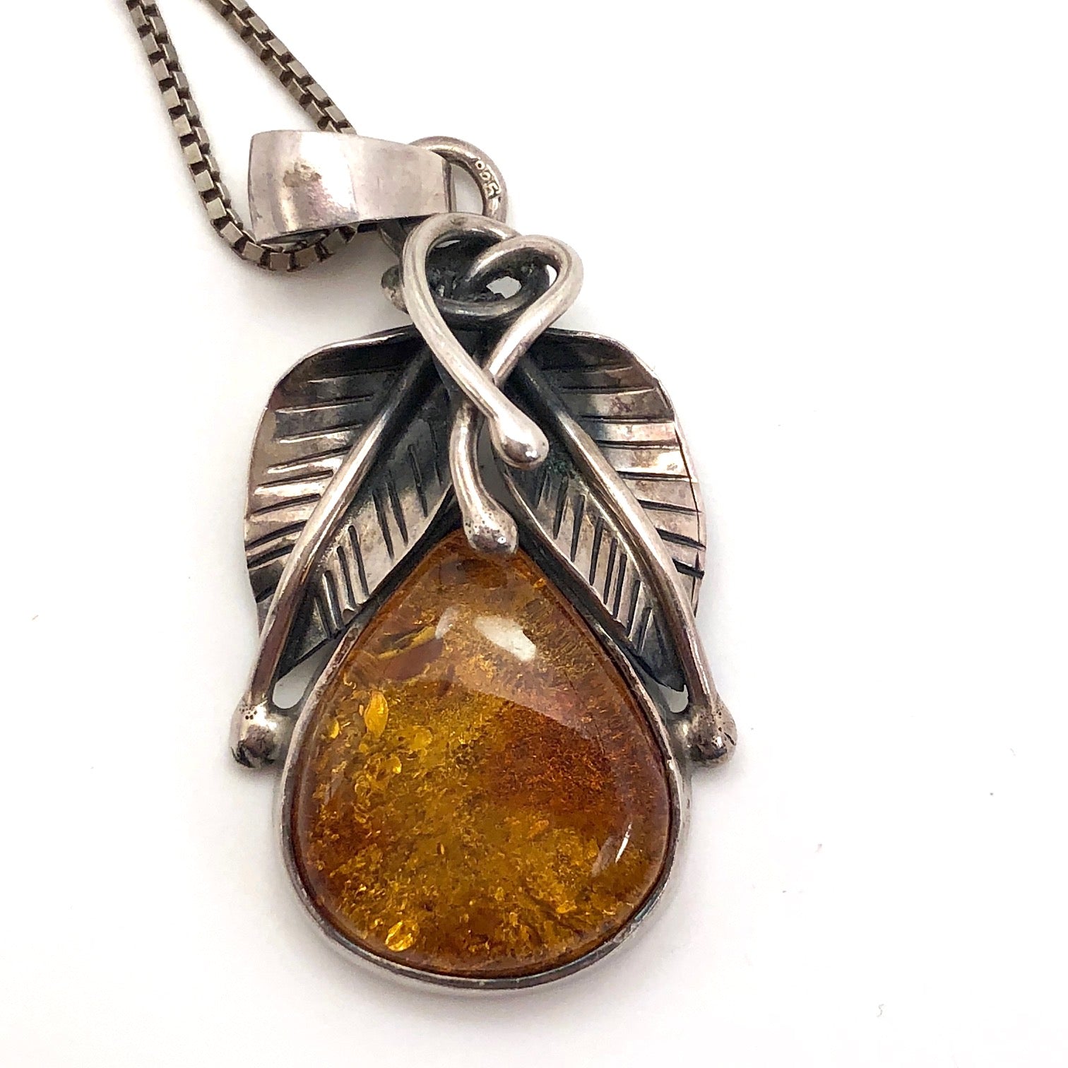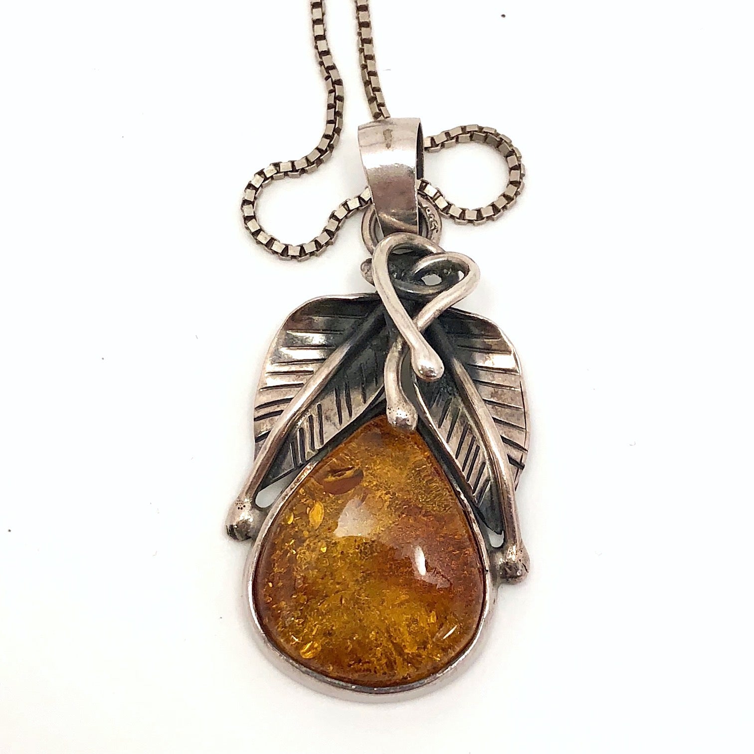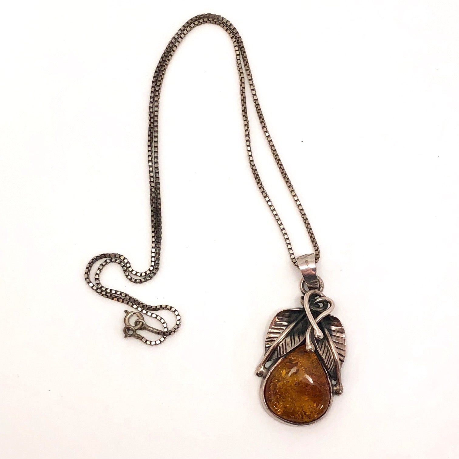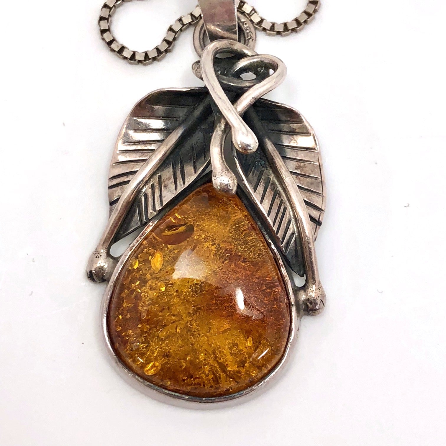 For those of you who carefully choose jewelry daily to complement your attire (I admire you!), this silver and amber pendant necklace is a great, eye-catching piece that that would lend a lovely final touch to many an outfit. Or, if you are like me, who wears the same silver jewelry all of the time, this is a perfect piece to add to the everyday mix. At 1.5"x1", It lands mid-way between delicate and chunky--bold enough to make a statement, but fine enough to invite a close look, and the beautiful piece of amber is set off perfectly by the finely detailed intertwining silver leaves.