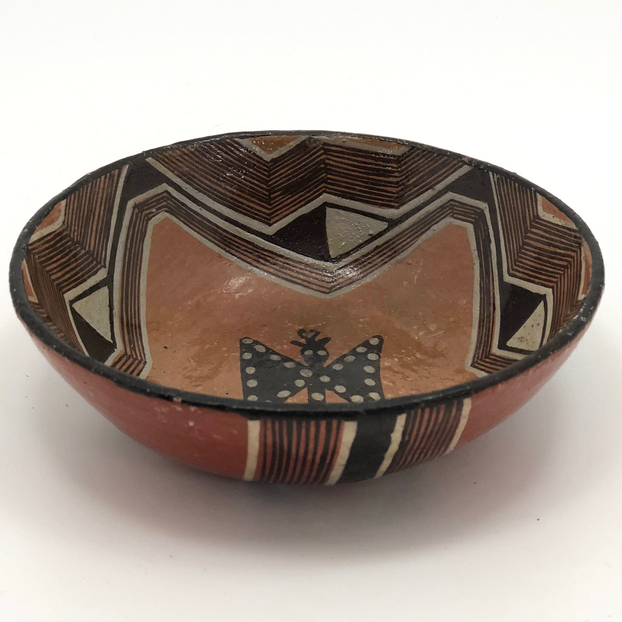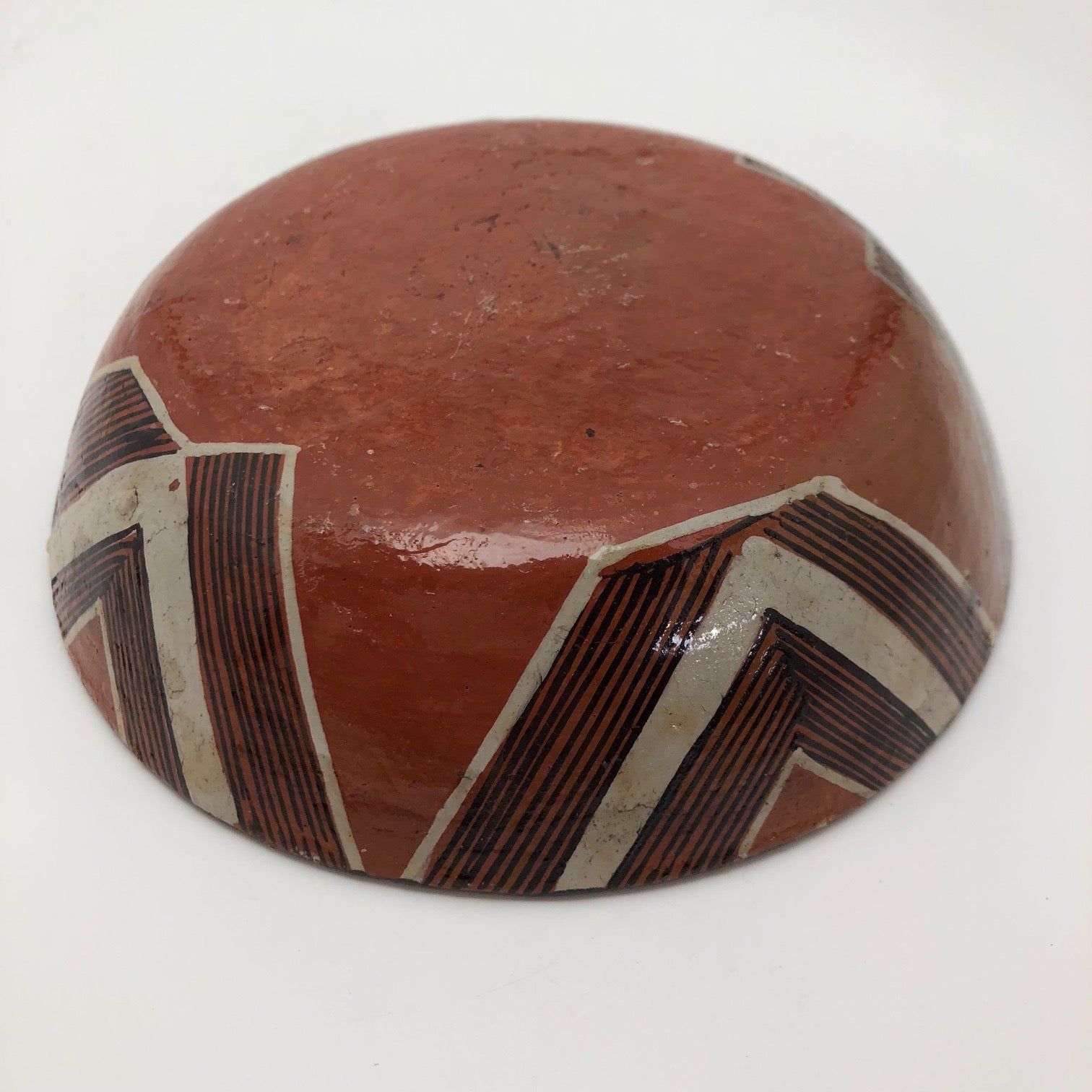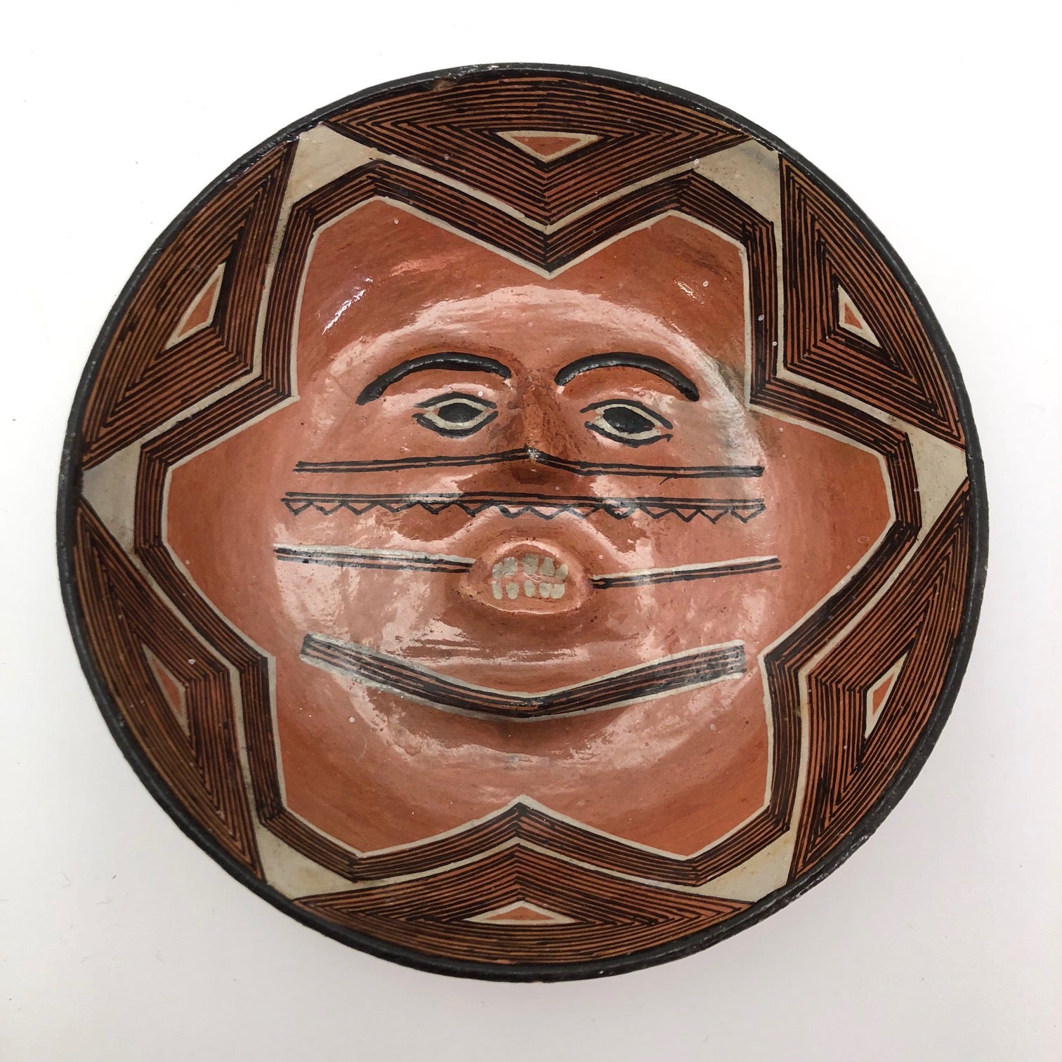 These two wonderful drinking bowls were made by indigenous Canelos Quichua women in the Oriente (upper Amazonian) region of Ecuador, probably in the 1970s or 80s. Between the star-shaped face of the larger, with its eyebrows, nose, and mouth (with teeth!) sculpted in relief; the bird/butterfly at the center of the smaller; and the wonderfully fine graphic patterns on both, I am completely charmed. No wonder that the pottery of this region is regarded as among the most beautiful in South America!
