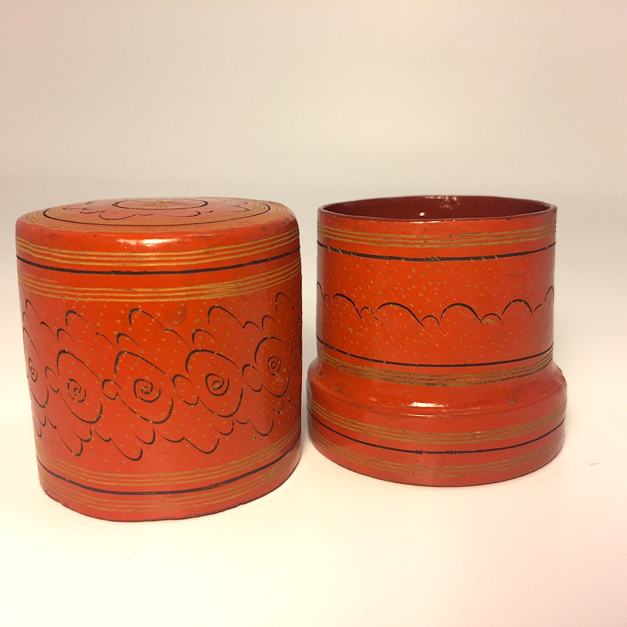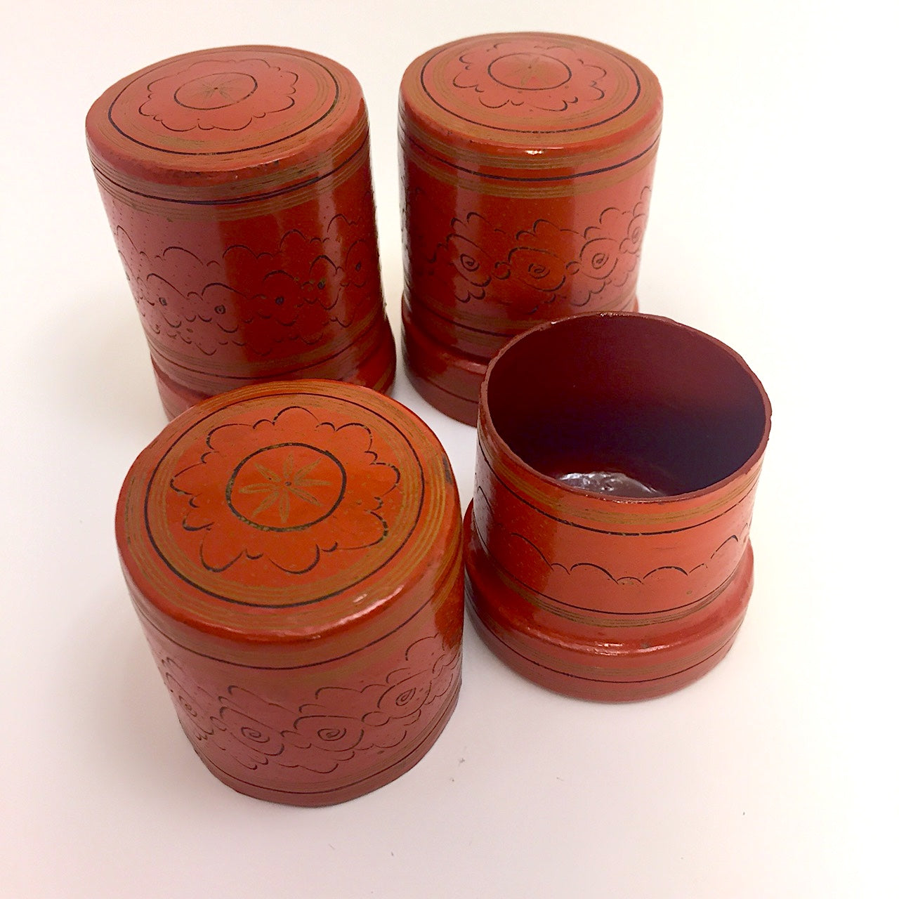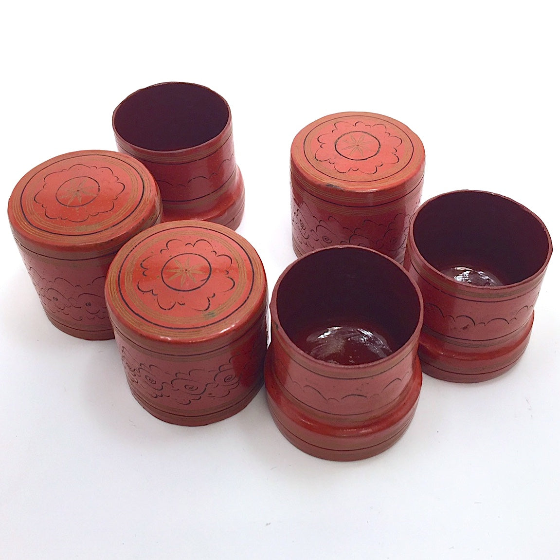This set of three gorgeous Cinnabar-colored Burmese lacquer betel boxes makes me want to find appropriately lovely and unexpected little things to store inside. While designed for storing chewing betel, they would be terrific on a vanity for holding small jewelry, on a desk for paperclips, pushpins, etc., or simply in a grouping on a shelf or table to add a pop of color and moment of beauty. But what about for storing baby teeth? Dried herbs? Magic powders?