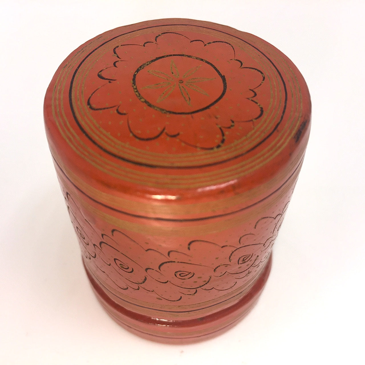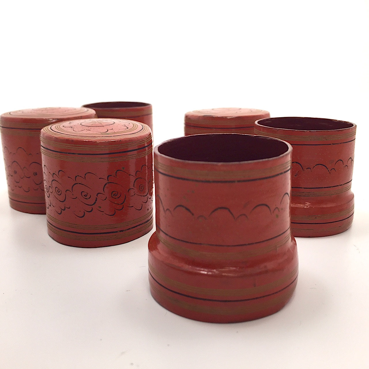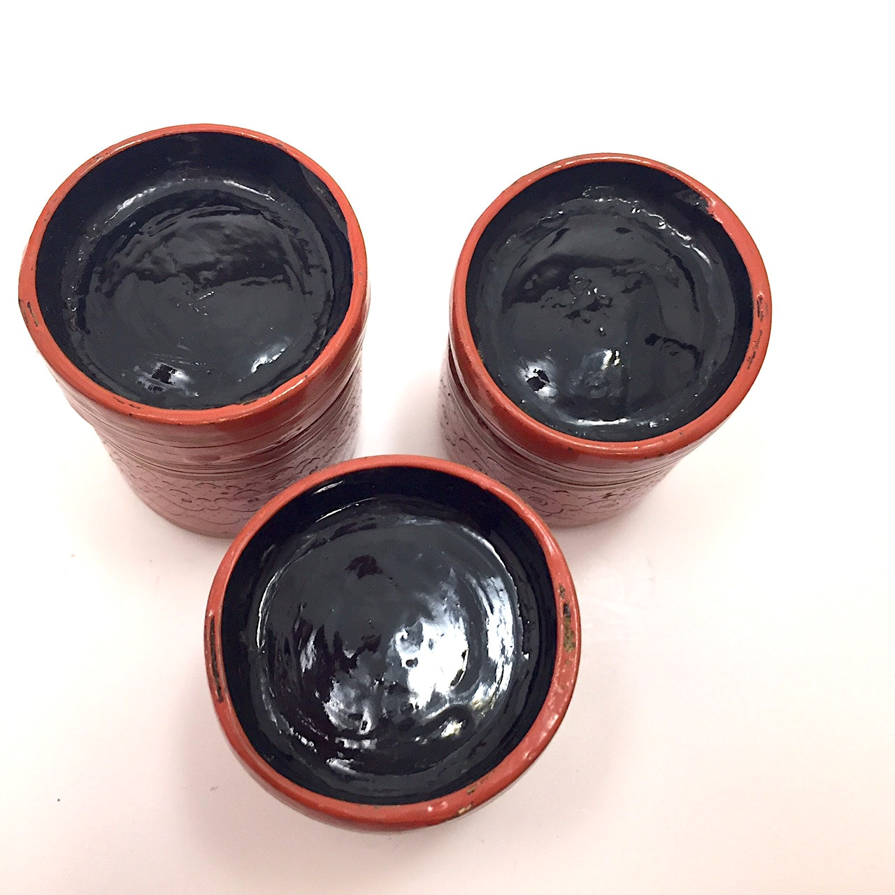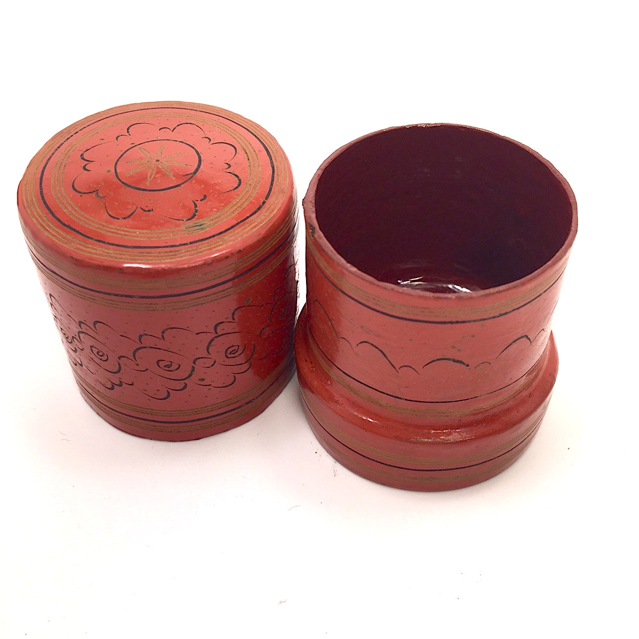 This set of three gorgeous Cinnabar-colored Burmese lacquer betel boxes makes me want to find appropriately lovely and unexpected little things to store inside. While designed for storing chewing betel, they would be terrific on a vanity for holding small jewelry, on a desk for paperclips, pushpins, etc., or simply in a grouping on a shelf or table to add a pop of color and moment of beauty. But what about for storing baby teeth? Dried herbs? Magic powders?