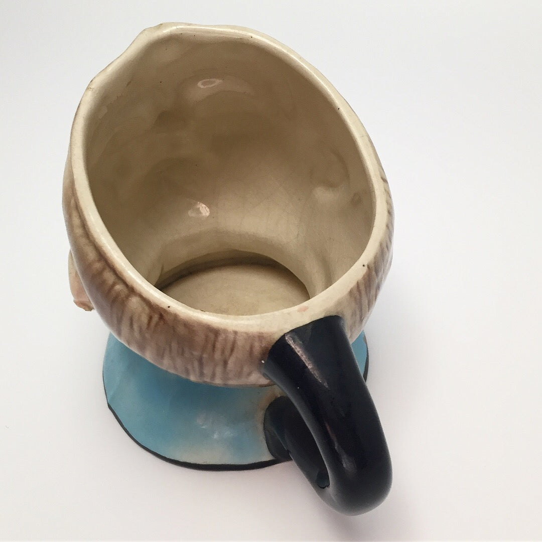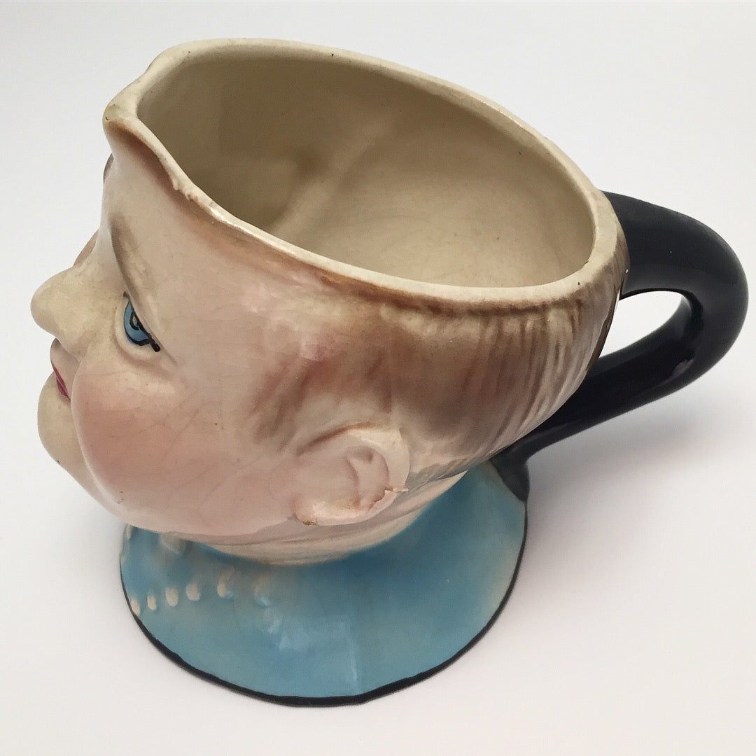 Stamped "Fat Boy England" and "Avon ware"on its bottom, this fabulous vintage milk jug would make a marvelous pitcher for the kitchen table, planter for a cactus or succulent, holder for pencils, pens or paperclips, and certainly a great conversation piece anywhere. And I swear, this baby's piecing blue eyes seem as if they are seeing into your soul as they follow you around the room, wherever you go!