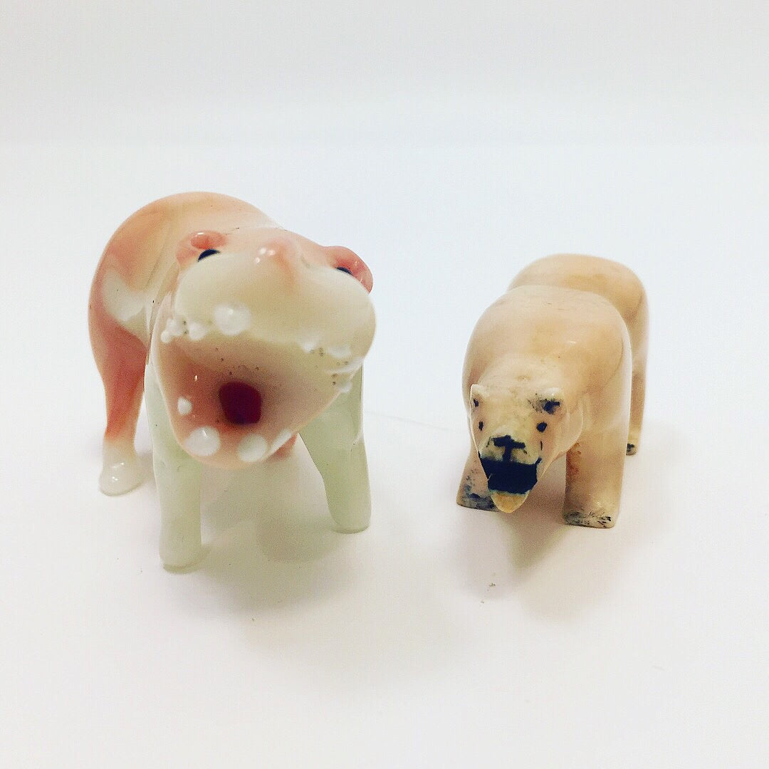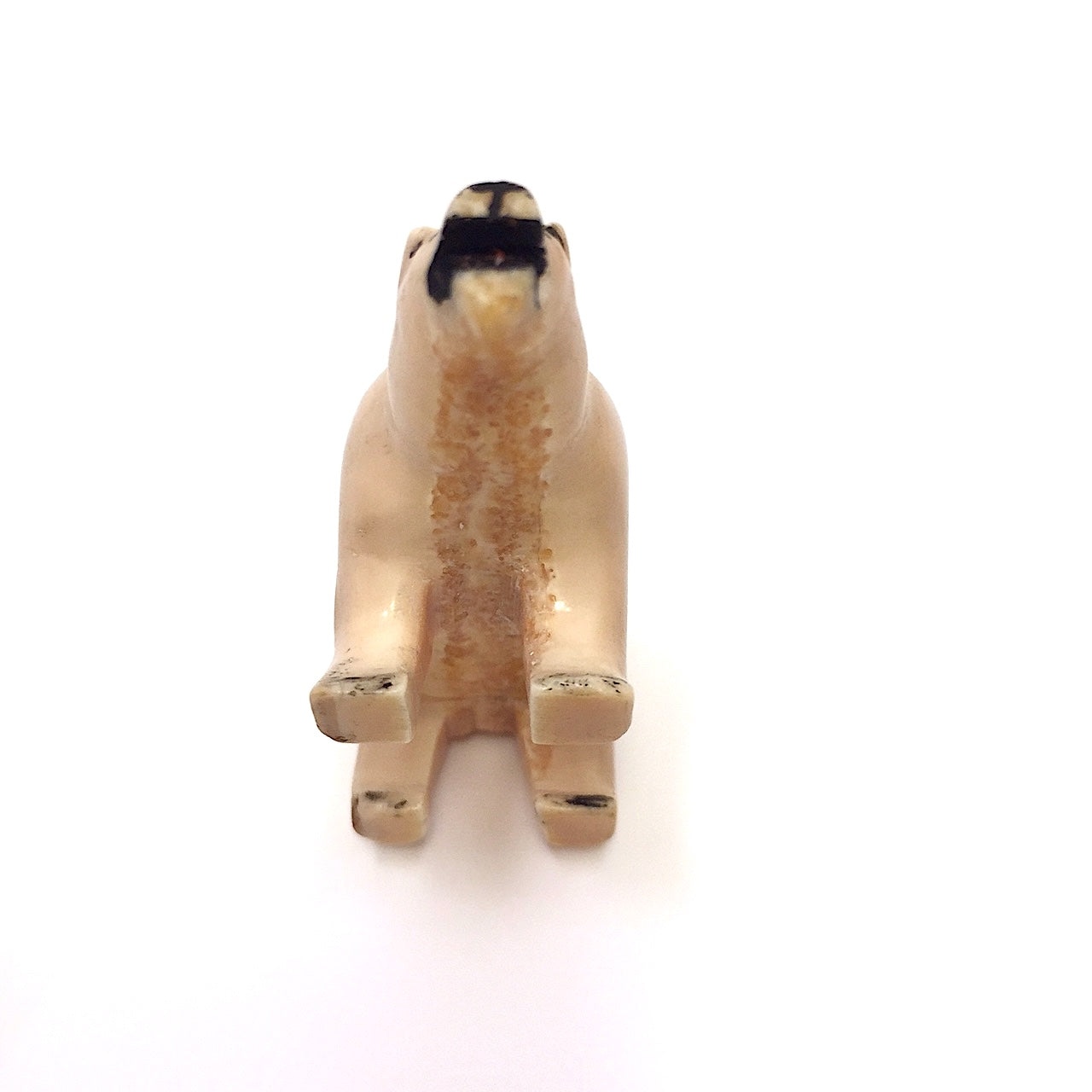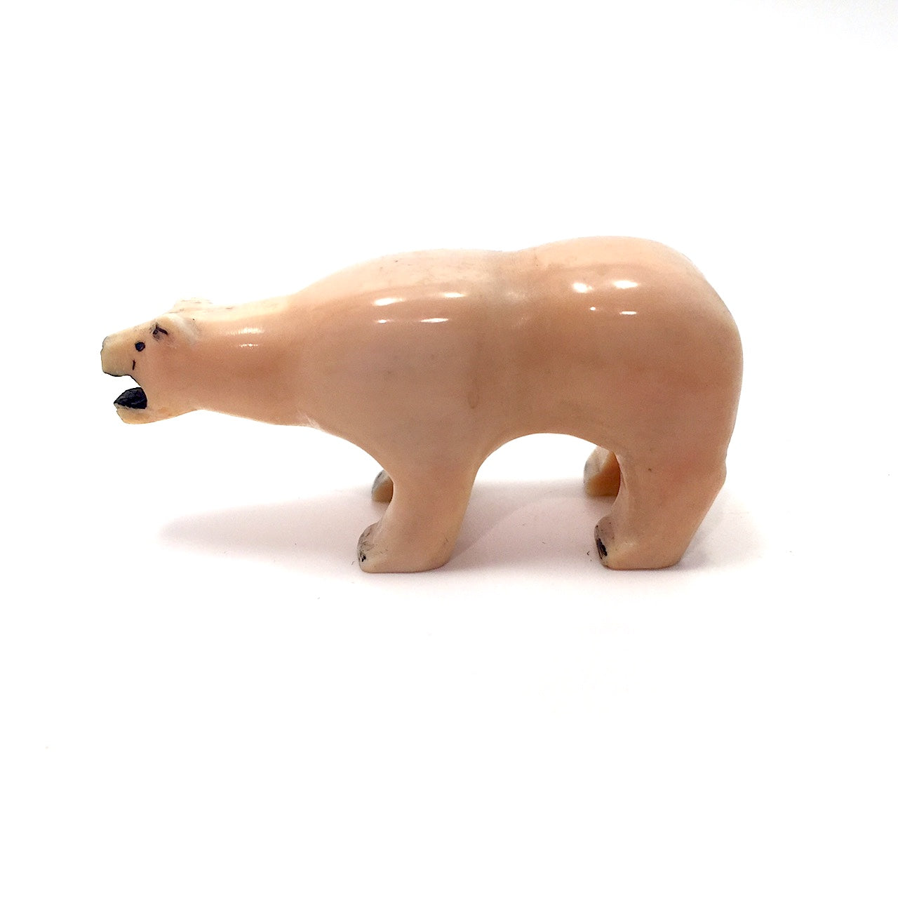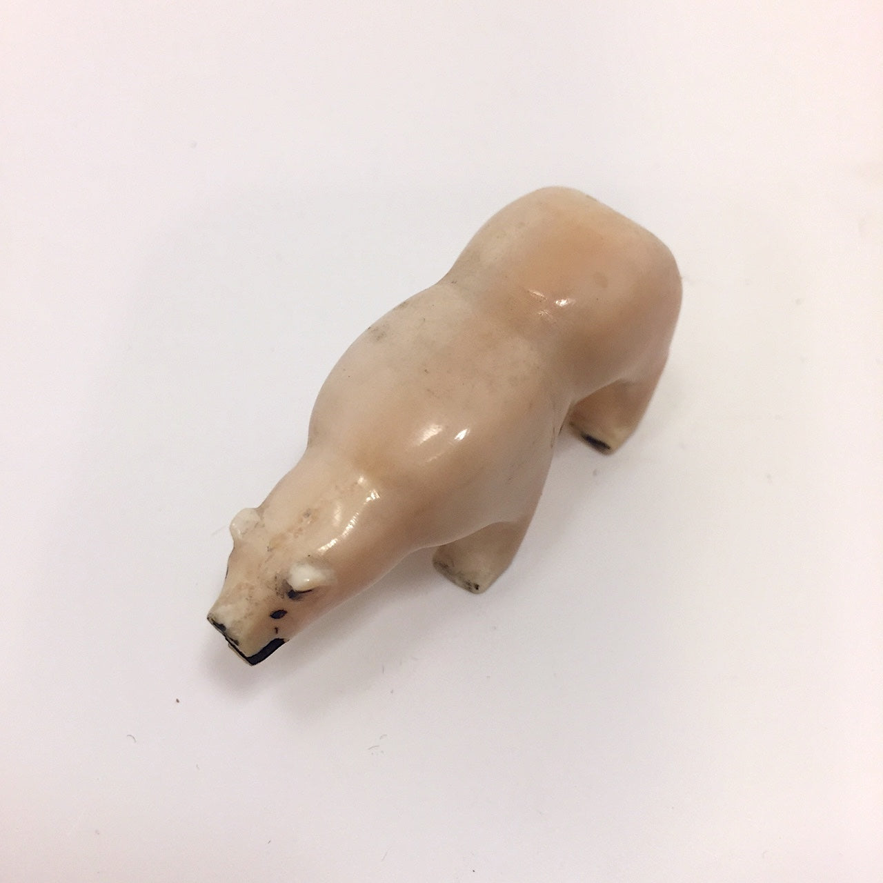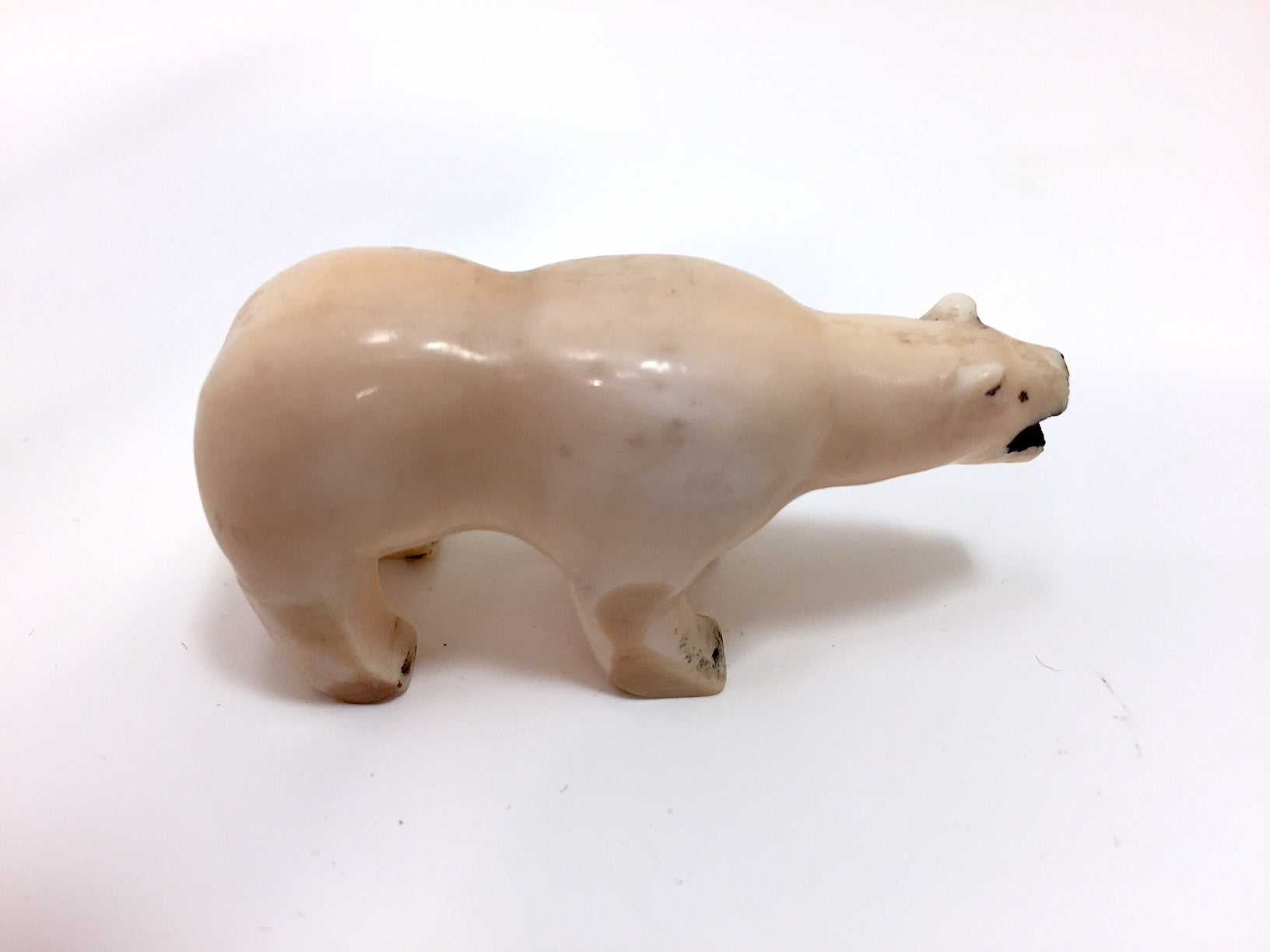 Among my very favorite tiny animal in the Critical EYE collection is this wonderful Inuit hand-carved polar bear, which seems at once fierce and friendly; stoic and animated with its outstretched neck and black painted mouth, eyes, ears, and feet. From the back and underside, a darker colored vein or marbilization is visible; this and the color lead me to believe the bear is carved from Walrus tusk.