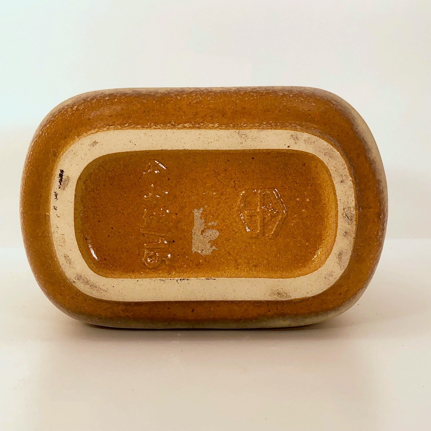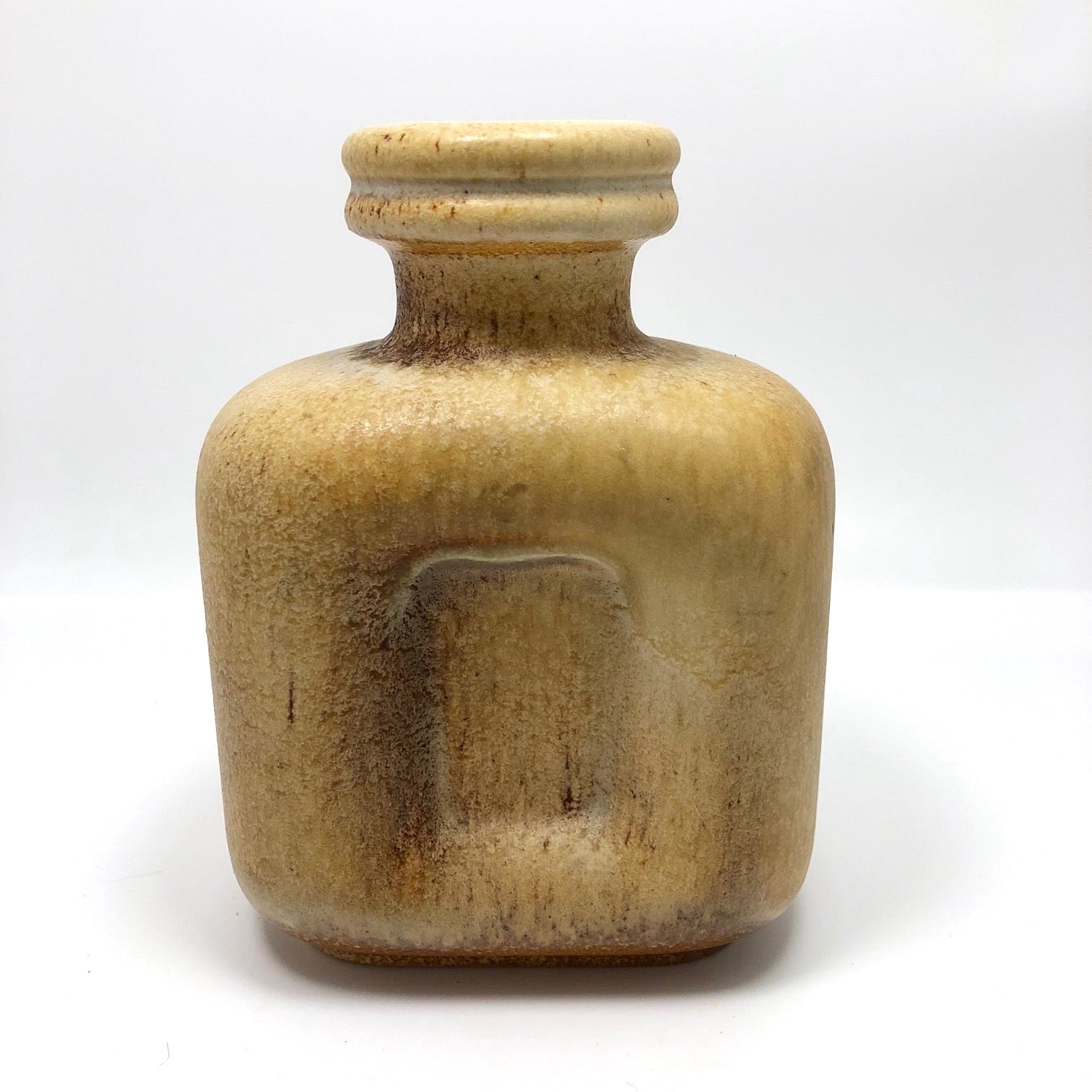 A great example of mid-century West German ceramics, this is a late 60s/early 70s West Steuler Keramik honey brown glazed bottle shaped vase, believed to have been designed by Cari Zalloni. The vase's squarish form is softened via rounded corners, recesses to its two long sides, and the curves of the double banded rim that tops its neck, which, along with its warm, painterly glaze, make the form feel earthy and organic.