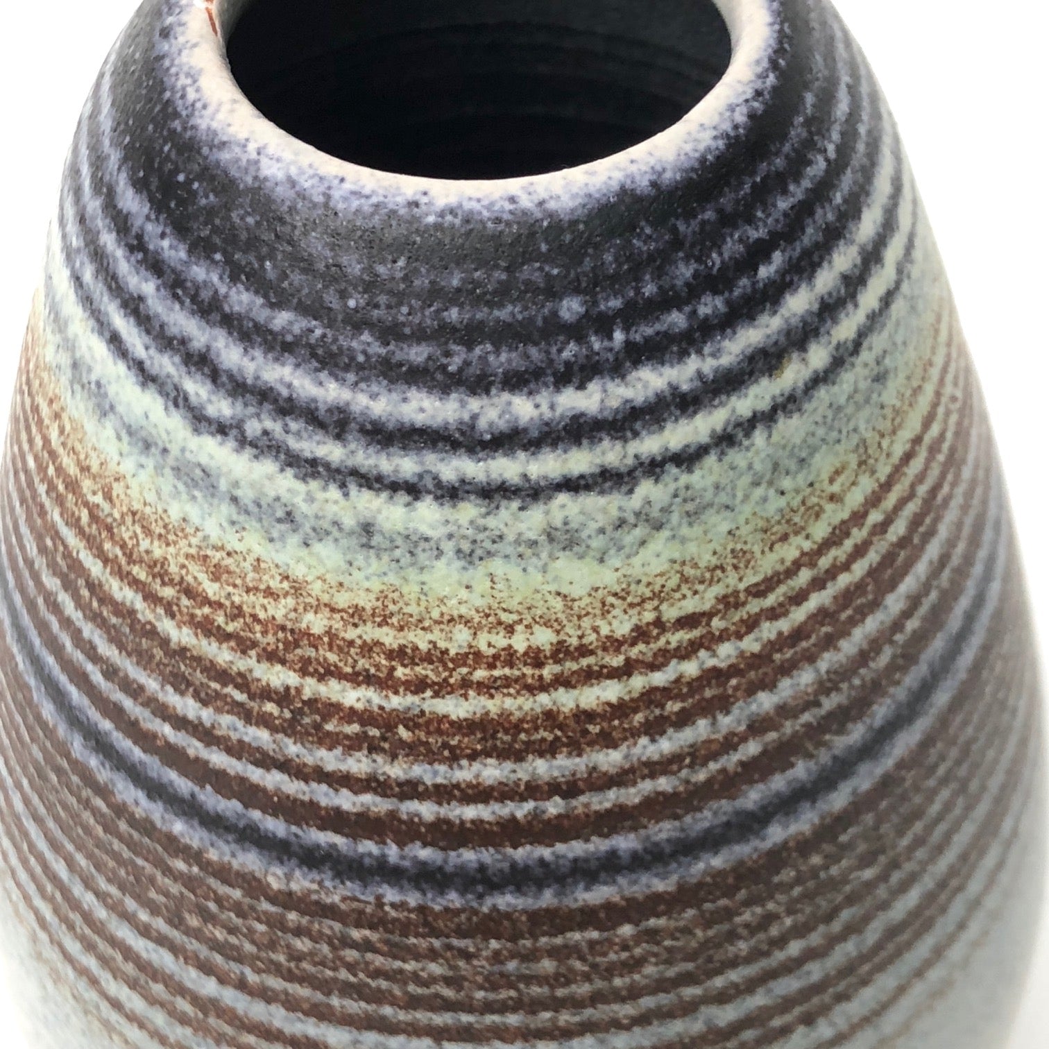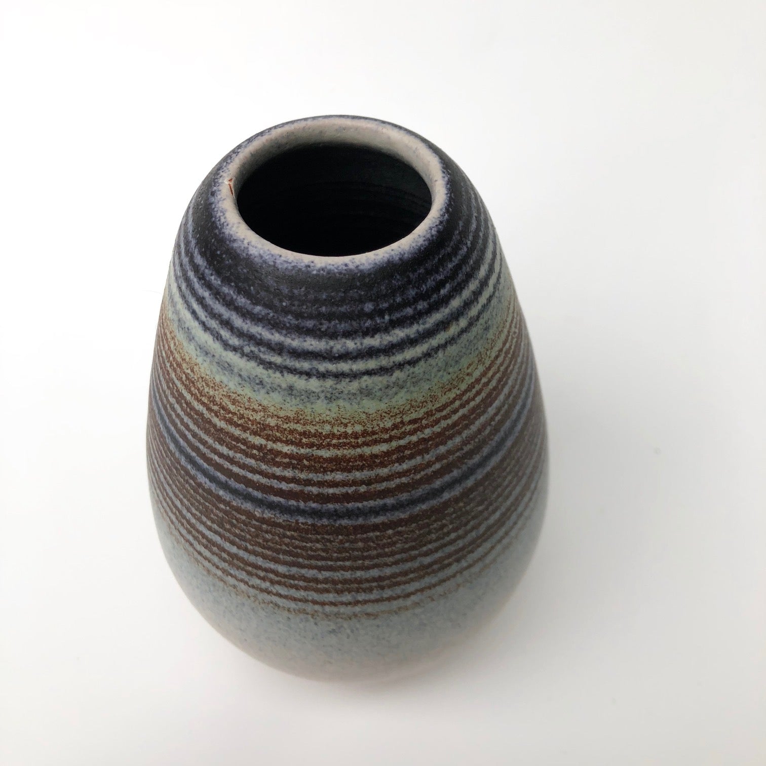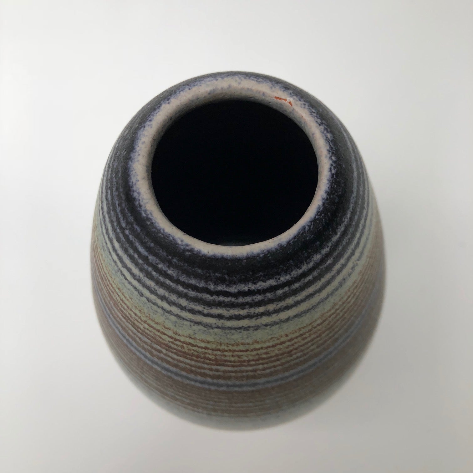 The vase, which is in perfect condition, appears unsigned. It measures 8.75 inches tall, with a diameter of 6 inches at the lip and 2.5 inches at the base. It was purchased from an estate sale that included a wonderful collection of mid-century and contemporary ceramics from Japan, Europe, and the U.S.