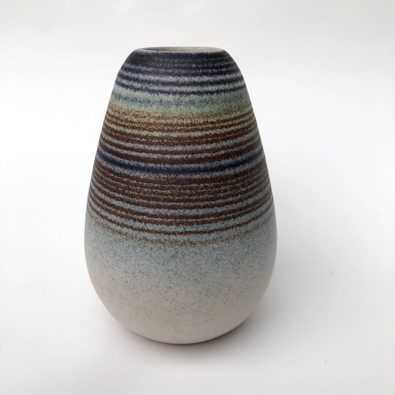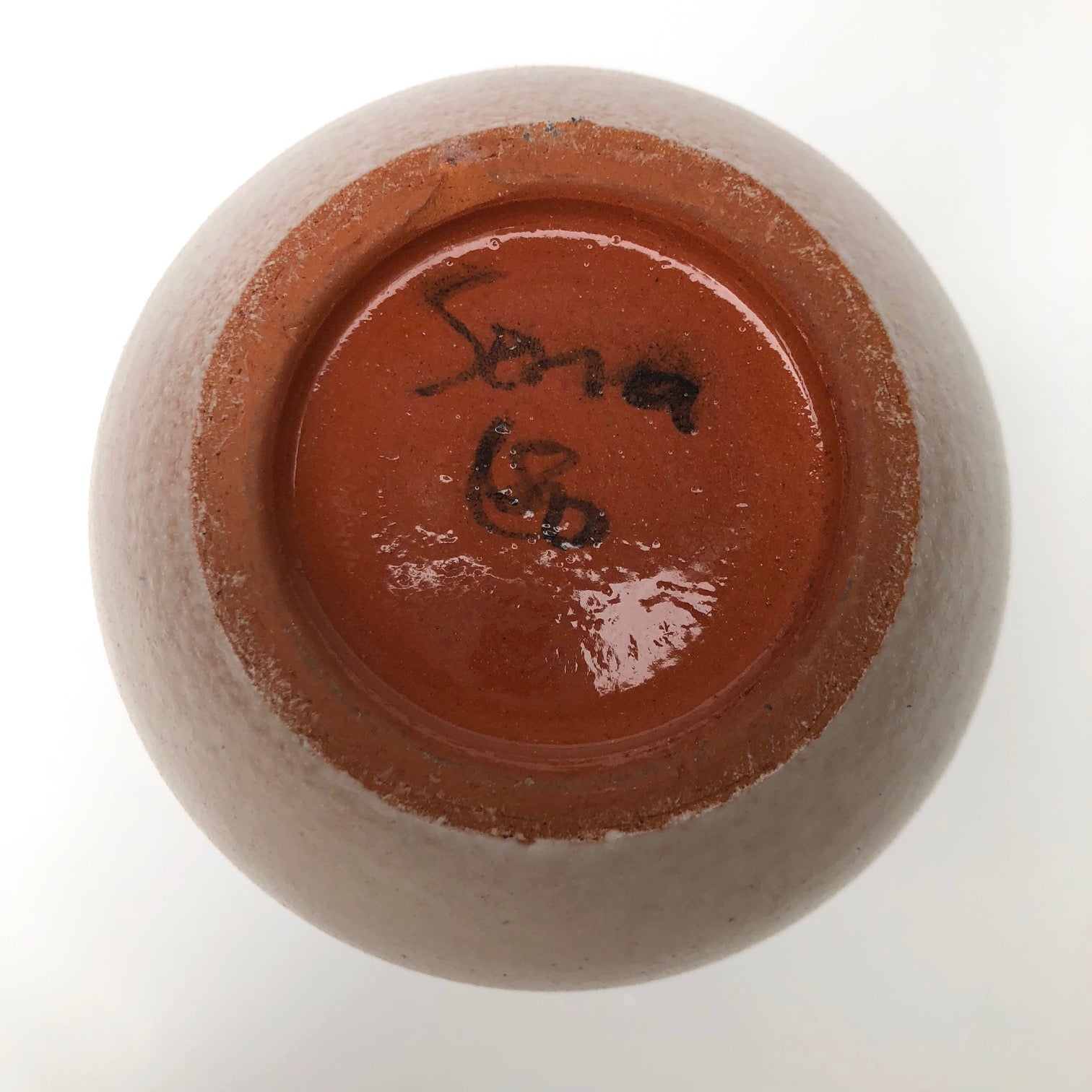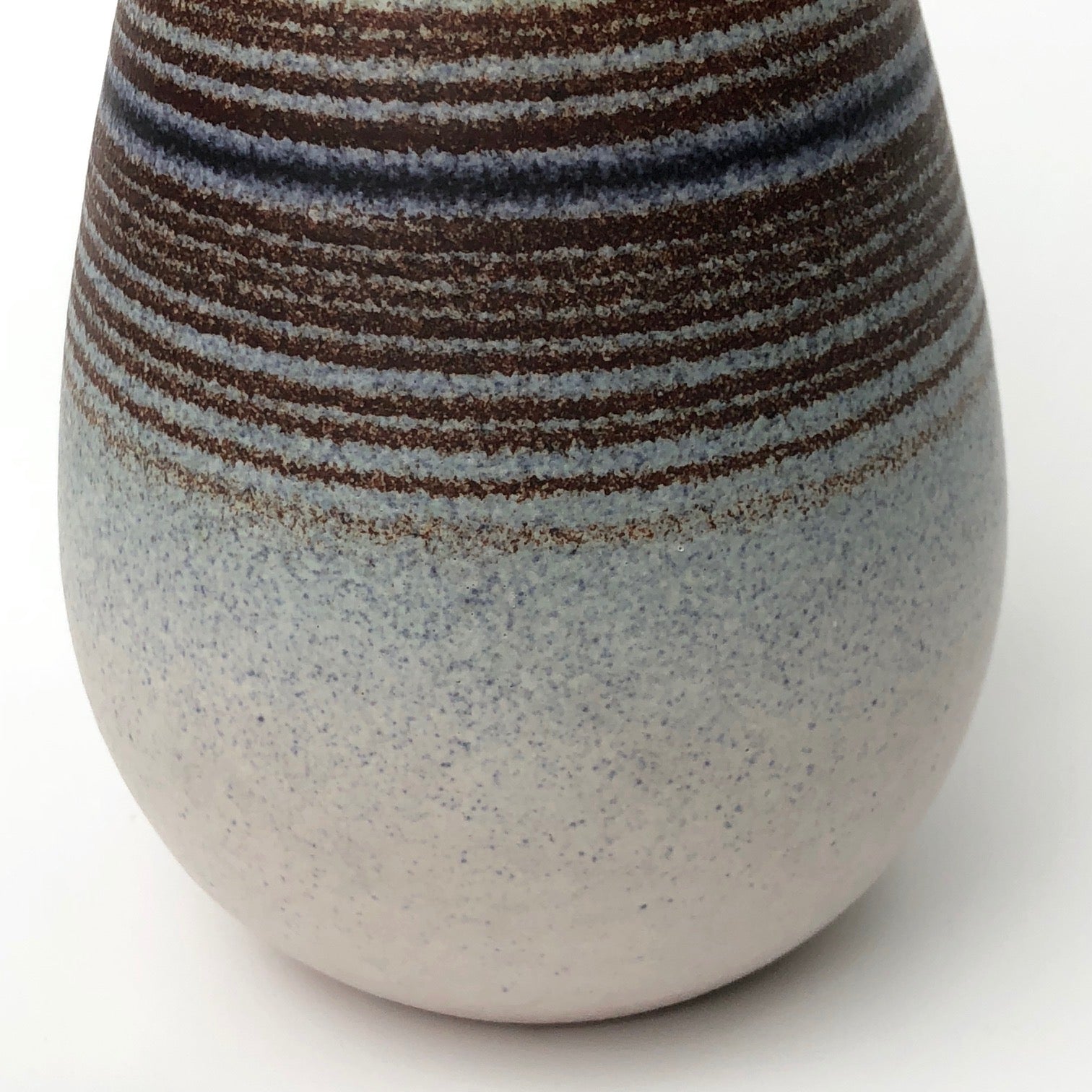 The vase, which is in perfect condition, appears unsigned. It measures 8.75 inches tall, with a diameter of 6 inches at the lip and 2.5 inches at the base. It was purchased from an estate sale that included a wonderful collection of mid-century and contemporary ceramics from Japan, Europe, and the U.S.
